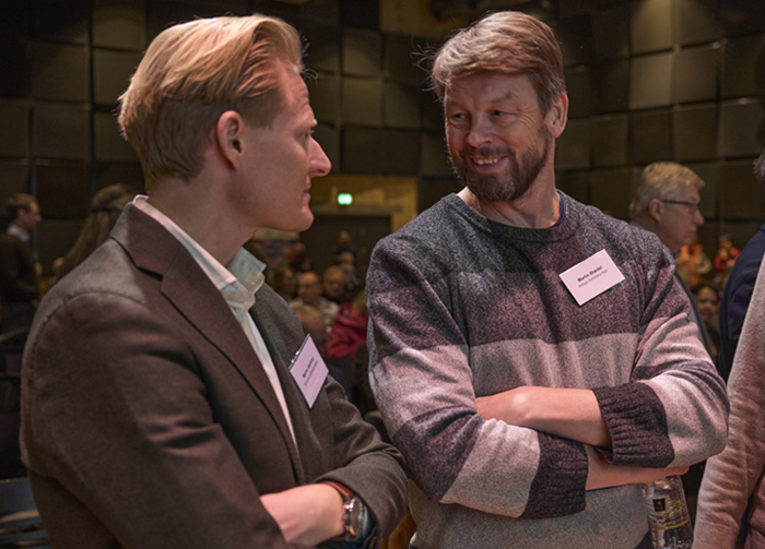 Formanden for det nye Erhvervsråd, Martin Barfoed, (tv.) i dialog med en virksomhedsleder.